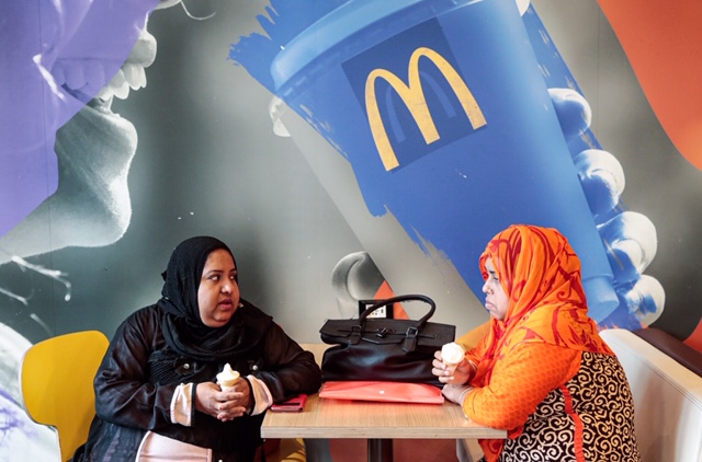 La maggioranza statistica dei clienti è comunque straniera, in una distribuzione che più o meno rispetta quella del quartiere. Quasi la metà vengono dall’Asia, ma l’atmosfera piace particolarmente ai peruviani, spesso in canottiera, tatuatissimi, testa rasata, con moglie e figli che si riempiono di patatine. Nel tardo pomeriggio arrivano le signore rumene, curatissime, chiacchierano con le amiche dopo aver lavorato tutto il giorno, con il viso sempre serio ma appagato. A volte le ho viste arrembate da sessantenni italiani con la gelatina, vestiti di bianco, che fanno battute tipo: «Ahó, nun te ne torna’ in Romania, eh!» quando le vedono andare in bagno. I filippini invece si riempiono di gelato e sguinzagliano i bambini. Mentre la radio del Mac manda Mahmood, un papà bengalese ruba una patatina a suo figlio che canta a memoria. Gli adolescenti cinesi occupano tavoli comuni, studiano mentre chattano al cellulare parlando tra loro pochissimo. Più spesso vedo gruppi di ragazze e ragazzi italiani di seconda generazione, accomunati soprattutto dall’identico accento fortemente romano. Proprio accanto a loro si siedono gli uomini d’affari cinesi, tre cellulari a testa durante le riunioni con i clienti. E neanche sfiorano con lo sguardo le tante donne indiane bellissime, elegantissime, che vengono a fare merenda con i figli. Raramente mi è capitato di incrociarle in giro per il quartiere, le vedo solo qui. Magari si siedono a un metro dai muratori dell’Est che hanno appena staccato, con le birre sul tavolo, e che fanno a gara per chi deve pagare o chattano su whatzup.