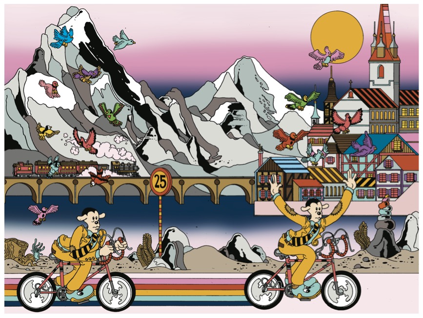 Gli avveduti, va da sé, quelle “Biciclette” le chiamavano “Hofmann”, o al massimo, come il giovine di cui supra, “Super Hofmann” (era un’epoca in cui, se si parlava di cartoni, si metteva “super” davanti a tutto, un po’ come “doppia goccia” dopo a tutto un decennio dopo: Super Simpson, Super Mario, Super Hofmann…). Qualcuno, tra cotali avveduti, risultava consapevole dell’iconografia associata al cartone, o almeno di parte di essa. Non dico che riconoscesse, nel posizionamento della luna, delle stelle e del sole (nonché della montagna – o piramide), certe incisioni alchemiche cinquecentesche che facevano riferimento alla trasmutazione della materia e, in fondo, del sé, verso uno stato più elevato di compimento esistenziale. Ma se non altro erano consapevoli del fatto che il tizio in bicicletta era Albert Hofmann, il chimico, e che un giorno del 1943, proprio mentre fuor dalla Svizzera infuriava al suo picco la Seconda Guerra Mondiale, prendevano forza e inerzia le procedure di sterminio di massa, mentre insomma là fuori accadeva il peggio del pegggio, uno svizzero di Basilea, città del Basilisco, città dell’alchimia, città della trasmutazione e del pharmakon – nulla avviene per caso, nulla è per caso, ma in fondo se tieni in mano questo libro immagino tu lo sappia o lo sospetti –, finito di lavorare nel suo laboratorio, partiva per il più assurdo e rivoluzionario giro in bicicletta mai visto o immaginato.