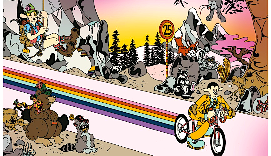 Gli avveduti, va da sé, quelle “Biciclette” le chiamavano “Hofmann”, o al massimo, come il giovine di cui supra, “Super Hofmann” (era un’epoca in cui, se si parlava di cartoni, si metteva “super” davanti a tutto, un po’ come “doppia goccia” dopo a tutto un decennio dopo: Super Simpson, Super Mario, Super Hofmann…). Qualcuno, tra cotali avveduti, risultava consapevole dell’iconografia associata al cartone, o almeno di parte di essa. Non dico che riconoscesse, nel posizionamento della luna, delle stelle e del sole (nonché della montagna – o piramide), certe incisioni alchemiche cinquecentesche che facevano riferimento alla trasmutazione della materia e, in fondo, del sé, verso uno stato più elevato di compimento esistenziale. Ma se non altro erano consapevoli del fatto che il tizio in bicicletta era Albert Hofmann, il chimico, e che un giorno del 1943, proprio mentre fuor dalla Svizzera infuriava al suo picco la Seconda Guerra Mondiale, prendevano forza e inerzia le procedure di sterminio di massa, mentre insomma là fuori accadeva il peggio del pegggio, uno svizzero di Basilea, città del Basilisco, città dell’alchimia, città della trasmutazione e del pharmakon – nulla avviene per caso, nulla è per caso, ma in fondo se tieni in mano questo libro immagino tu lo sappia o lo sospetti –, finito di lavorare nel suo laboratorio, partiva per il più assurdo e rivoluzionario giro in bicicletta mai visto o immaginato.