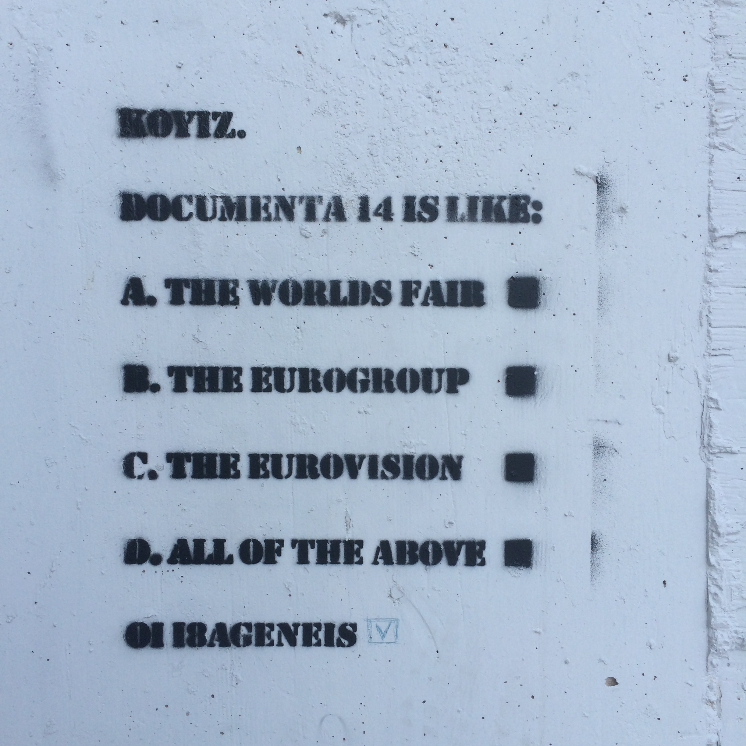 ATENE. Narcisisti di tutto il mondo unitevi. Crapumenta 14. La scritta in vernice nera corre lungo il muro di uno dei più belli fra gli edifici neoclassici che affacciano su Dionysiou Aeropagitou, la pedonale ai piedi del lato sud dell’Acropoli. Qui è stata inaugurata, il 9 aprile scorso, dOCUMENTA 14, uscita per la prima volta dal 1955 dai confini di Kassel per “imparare da Atene” come sostiene il suo slogan. La celebrazione è stata idealmente sfarzosa e i critici non l’hanno perdonato.