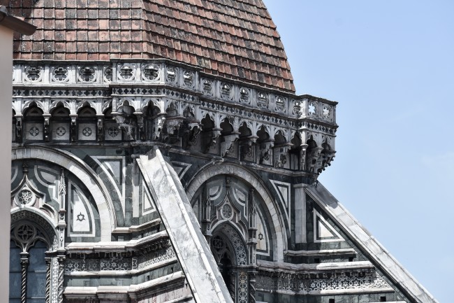 Ci avviamo lungo via Ginori. Quando la piazza si apre, fra turisti in mascherina, Givone alza gli occhi al cielo estasiato. È un fiume in piena e non resiste a tornare con mille particolari su ciò che ho letto nel suo libro. Il senso di vergogna dei fiorentini di fronte alla cattedrale rimasta scoperta per ben più di un secolo, visto che le idee per completare la sua opera Arnolfo di Cambio se le portò nella tomba con la morte improvvisa nel 1302. Sulla immensa base ottagonale nessuno riusciva a immaginare come fosse possibile erigere una cupola. Finché non arrivò Filippo di ser Brunellesco Lapi, nato a Firenze nel 1377 che iniziò a dirsi sicuro del fatto suo di fronte allo stupore e all’ironia dei concittadini. “Mi ero convinto che per Santa Reparata ci volesse qualcosa che non è né cupola né piramide, ma è al tempo stesso cupola e piramide” dice Brunelleschi – nella ricostruzione narrativa di Givone – al figlio adottivo, il cosiddetto Buggiano, riflettendo sull’enigma che nessuno riusciva a risolvere. Il Battistero poteva rappresentare un esempio e uno stimolo: una piramide formata da otto triangoli uguali e che al tempo stesso è una cupola perché copre una semisfera la quale lo sorregge e lo consolida. I fiorentini però chiedevano conferme e prove dell’idea di cui Brunelleschi si riteneva certo, conferme che l’uomo non voleva e non poteva dare.