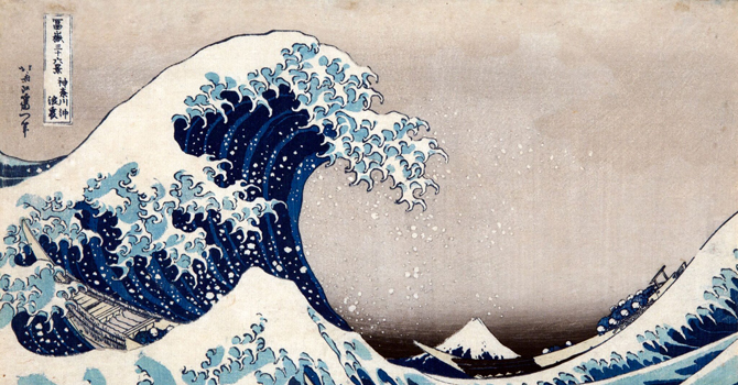 Per fortuna, quando si ha a che fare con delle vere opere d’arte, l’esperienza estetica va oltre la volontà umana. Ecco così che grazie all’abilità artistica di Hokusai (1760 – 1849) è possibile intuire la sua idea del rapporto tra Natura e giapponesi. Un popolo infaticabile, totalmente agente all’interno di un ambiente naturale immenso e anch’esso in eterno movimento (visibile e non): l’ukiyoe, letteralmente “immagini del mondo fluttuante”. Hokusai rappresenta i giapponesi, spesso minuscoli, sovrastati dalla mutevolezza ambientale,  con facce e muscoli ben definiti, in uno sforzo costante e con il corpo sempre in tensione. Ma l’immagine non è mai tragica o drammatica. È l’espressione di un cosmos che si regge sui pilastri dello shintoismo, dal quale emerge il concetto di Sacro: si percepisce il senso di caducità dell’essere umano, rispetto alla spaventosa e assieme munifica bellezza della Natura. Ma l’importante è agire, perché è naturale – nel vero senso della parola – farlo. I giapponesi fanno, come fa la natura: sono l’uno lo specchio dell’altro. In Hokusai è come se trapelasse l’attiva, cocciuta e assolutamente non nichilista arrendevolezza del popolo del Sol Levante verso i moti degli spiriti naturali. È un’arrendevolezza dovuta alla somma gratitudine verso la generosità della Natura stessa. Per capirlo, basta osservare come Hokusai raffigura l’acqua: una materia pronta per l’uso, una sostanza funzionale per l’uomo; onnipresente e per questo indispensabile, anche se può essere tremenda e distruttrice. Quella del Maestro è un’acqua che appartiene al mondo delle idee: è l’idea stessa di acqua. Ecco quindi la delicatezza di Hokusai, trasmessa da un gusto compositivo impeccabile, da un tratto leggero, ma definito e dai toni pastello; salvo quell’utilizzo incisivo e insieme dolcissimo del blu di prussia (colore che ha superato le barriere protezionistiche giapponesi, proprio nel tempo dell’attività dell’artista).