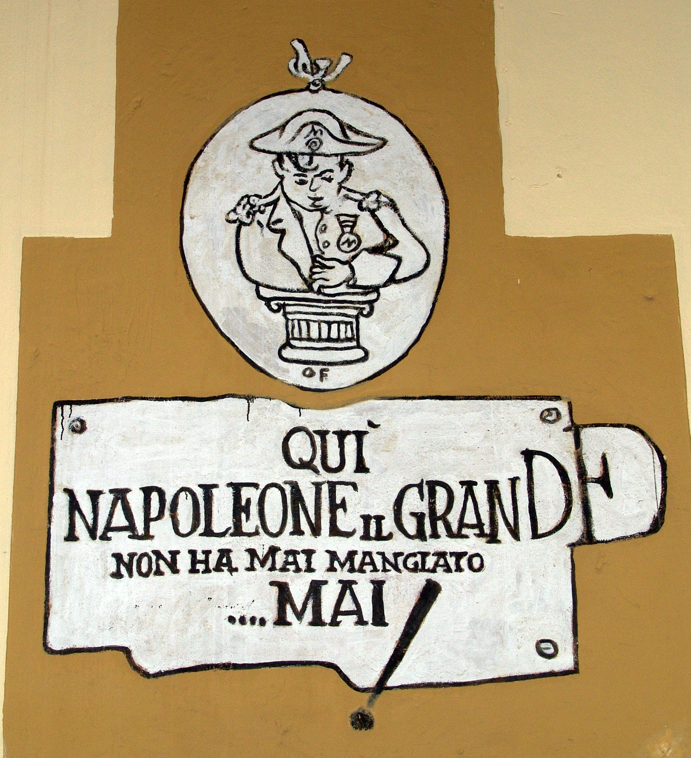 Del resto De Chirico non fu che la punta dell’iceberg. Il gruppo era formato da artisti di diverse tendenze che attrassero intellettuali da ogni parte del mondo. Lo zoccolo duro era formato da Rodolfo Marma, Enzo Faraoni, Emilio Ambron con la compagna Anna Maria D’Annunzio (nipote del poeta), Renzo Baraldi, Iginio Gonich detto Gonni, Beppe Lieto, Furio Cavallini e Silvano Bozzolini, ma i fiancheggiatori erano parecchi. Su tutti Marcella Olschki, scrittrice nipote dell’editore fiorentino, Mario Cartoni, giornalista della Nazione, e uno dei più eccentrici animatori della trattoria: l’irresistibile Ormanno Foraboschi, intellettuale d’altri tempi, grande amico di Luciano Bianciardi, creatore di detti famosi e di slogan pubblicitari indimenticabili, come “Il tonno che si taglia con un grissino”. Fu proprio Ormanno Foraboschi, assieme a Gonni (il più scatenato e geniale della cobriccola – di cui si diceva che avesse intervistato Hitler) a dipingere il motto che sarebbe apparso sul muro della trattoria, rendendola celebre: “Qui Napoleone il grande non ha mangiato mai”.