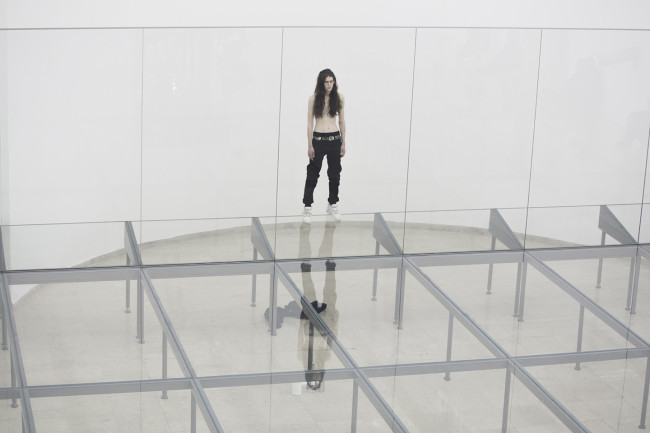 Il messaggio che Anne Imhof vuole veicolare, mi spiegano i testi e i comunicati stampa, è fortemente politico, una denuncia del Potere, qualcosa di orwelliano se volete, ma qui tutto accade in una veste tragicamente (nel senso teatrale) punk e molto più contemporanea. “Faust” significa “pugno”, e i pugni dei performer colpiscono spesso i vetri che strutturano in padiglione su più livelli, allargando e al tempo stesso riducendo la possibilità di visione dello spettatore, ma quelli che sento (dolorosamente anche) sono pugni di rabbia che però non riescono a colpire il mostruoso bersaglio a cui si oppongono, perché per Imhof ormai anche i nostri corpi non sono altro che oggetti del Capitale, il cui tragico dominio appare incontrastato e incontrastabile.