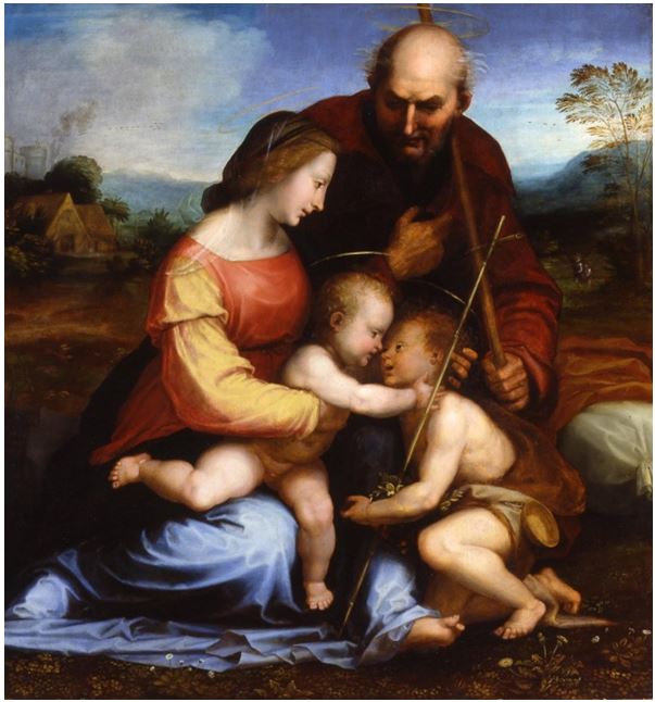 Non so dire in quale sala fosse invece esposta la Sacra Famiglia di Andrea del Sarto – il suo numero progressivo di cartellino era il 5, mentre quello di Fra’ Bartolomeo era il 15, comunque non lontano. Potrebbe quindi darsi che Cortázar abbia effettivamente visto entrambe le opere e abbia poi confuso, per via dello stesso soggetto e perché in fondo il Sarto e Fra’ Bartolomeo sono accomunati da vari aspetti. Se così fosse, il suo vivido ricordo – tanto più perché così focalizzato e, diciamo, “insulare” – potrebbe riguardare piuttosto le piccole figure che in realtà si vedono ancora bene sullo sfondo, a destra, nel dipinto di Fra’ Bartolomeo, e che rappresentano, per la precisione, l’angelo che guida il giovane Battista nel deserto.