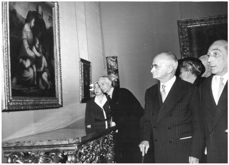 Infatti, all’inizio degli anni ’50 nelle sale di Palazzo Barberini – più precisamente nella Sala di Sacchi – era esposta la tavola di Fra Bartolomeo con la Sacra Famiglia (che oggi è a Palazzo Corsini) , come si evince dal vecchio catalogo di Nolfo di Carpegna (1953) e come testimonia più direttamente questa foto che ritrae il presidente Einaudi in visita alla Galleria nel 1952 (o nel 1955, non sono sicuro).