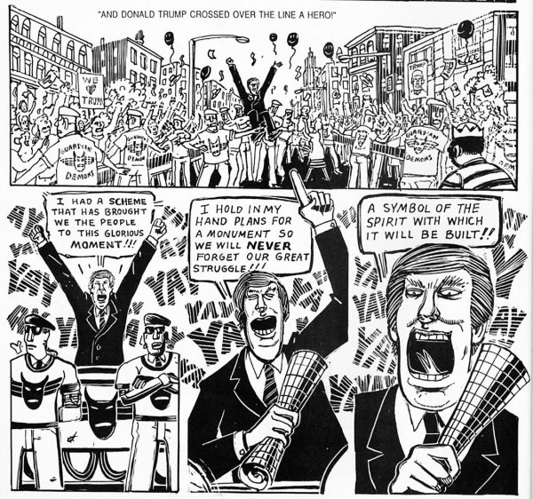 «Proprio The Wall è il titolo di quelle tavole. Avevo visitato Berlino, giusto poco prima del crollo del Muro. E stavo elaborando il fatto e l’idea è spuntata mentre Trump, allora solo un’orribile figura di immobiliarista, e Helmsley, un altro costruttore narcisista, stavano erigendo proprietà a New York. Ho immaginato Trump che innalzava un muro, separando east e west side a Manhattan, isolando i ricchi dai poveri, quel che avveniva già con Ronald Reagan. Le mie paure sono diventate realtà. Allora dovrei dirle che nel mio prossimo lavoro, qualora i miei disegni abbiano davvero qualcosa di magico nel predire il futuro, dovrei riscrivere e disegnare qualcosa di positivo oppure utilizzare la gomma della mia matita utile a cancellare».