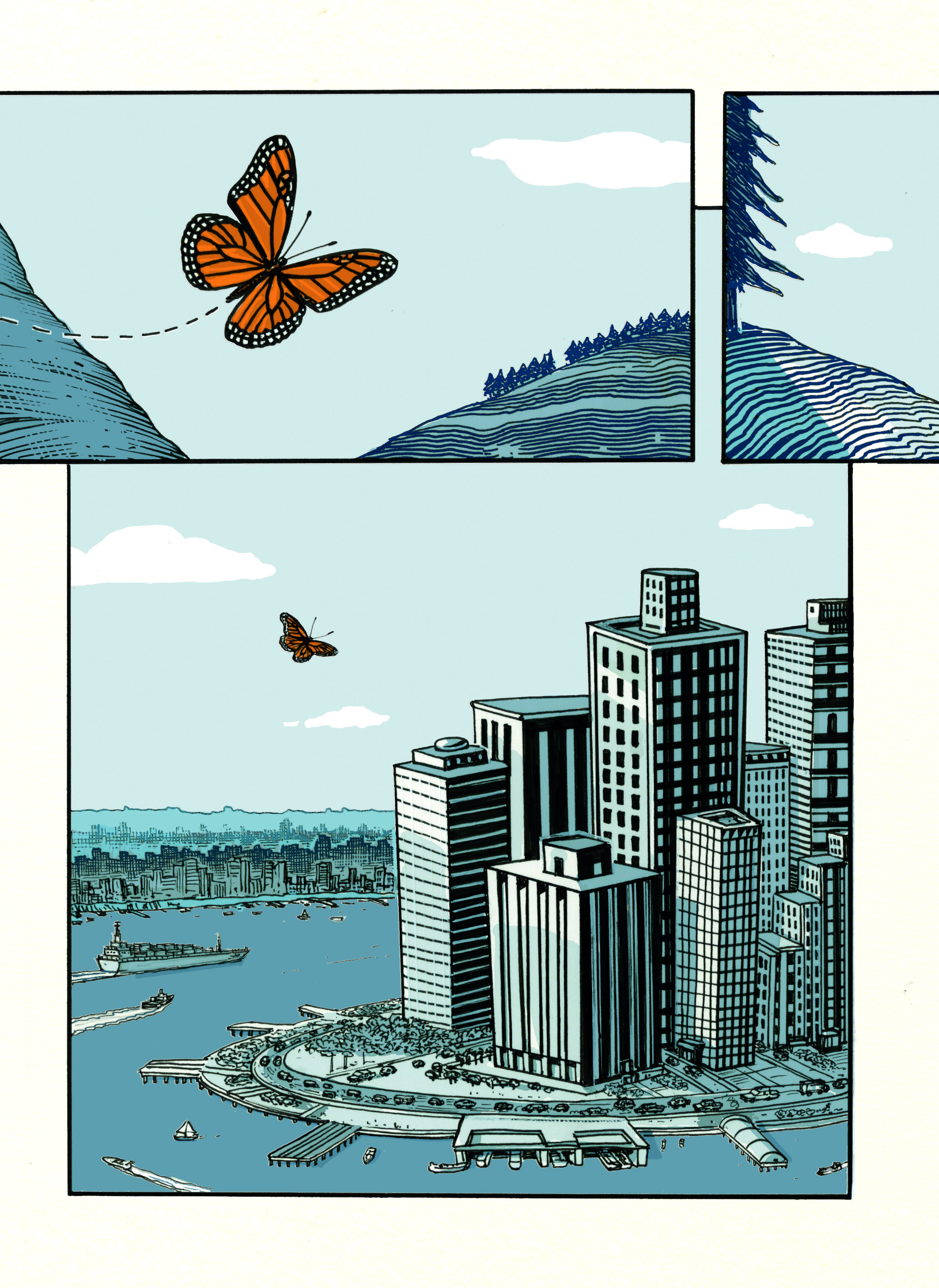 «Sì, con la migrazione della farfalla pongo uno sguardo potente sulla mia infanzia. Prima dei fumetti ero interessato agli insetti e alle farfalle in particolare, e sentii raccontare di questo luogo in Messico dove tutte queste farfalle monarca si accoppiavano. È stato come un sogno pensato, vidi qualcosa su National Geographic e potevo solo immaginare come sarebbero state. Vedere dal vivo milioni di farfalle mi ha trasmesso una quantità inattesa di speranza. È tantissima vita concentrata, aiuta ad avvertire una connessione spirituale con la bellezza del mondo. Sono riuscito a portare e rinnovare la passione infantile per gli insetti. Negli Stati Uniti stanno scomparendo, se ne vedono sempre meno a causa della chimica».