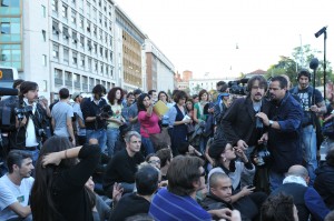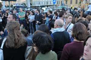 Per la cronaca. L’incontro di Carta batte forbice ieri si è tenuto lo stesso, nonostante tutto. Non dentro ma fuori dalla biblioteca, nel grande piazzale, in un’assurda cornice da guerriglia urbana, circondati dai poliziotti, con noi relatori che (al posto del microfono previsto) ci siamo passati l’un l’altro il megafono, pervasi (relatori e partecipanti) da un’atmosfera in cui solidarietà, voglia di stare insieme, paura, frustrazione, sensazione di aver dato vita a qualcosa di imprevisto e imprevedibilmente rivelatorio, continua rigenerazione emotiva erano mischiati tra di loro senza soluzione di continuità.