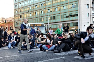 Così, a un certo punto, alcuni “manifestanti” hanno occupato la strada, il trafficato Viale Castro Pretorio, e hanno cominciato a distribuire a chi passava i volantini dell’iniziativa. Un automobilista su quattro o cinque era incazzato nero perché il traffico veniva improvvisamente rallentato o bloccato. Gli altri automobilisti (che non avevano la più pallida idea del perché ci trovassimo lì) hanno iniziato invece a esprimere solidarietà, credendo di ritrovare ormai in chiunque porti una divisa o altro simbolo risalente allo Stato italiano il segno di un nemico a prescindere. La polizia a quel punto è intervenuta. Qualche tafferuglio, un inizio di violenza. Niente manganellate. Solo strattoni, spintoni, un qualcosa che forse stava per scatenarsi ma è stata subito ricacciata nel regno del potenziale.