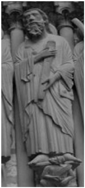 Oppure sulla cattedrale di Chartres, sul portale meridionale; le conchiglie del Santo stanno legate a una banderuola indossata a tracolla: