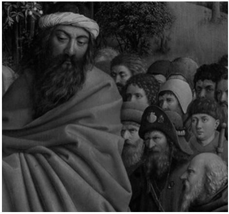 Nella parte inferiore al centro c’è il grande pannello con l’Adorazione dell’Agnello Mistico. Ai suoi lati, altri quattro pannelli. A sinistra: i Buoni Giudici e i Cavalieri di Cristo. A destra: gli Eremiti e i Pellegrini. Nell’ultimo pannello a destra è impossibile non notare tra questi un pellegrino con, fissata al centro del suo copricapo, una conchiglia di San Giacomo.