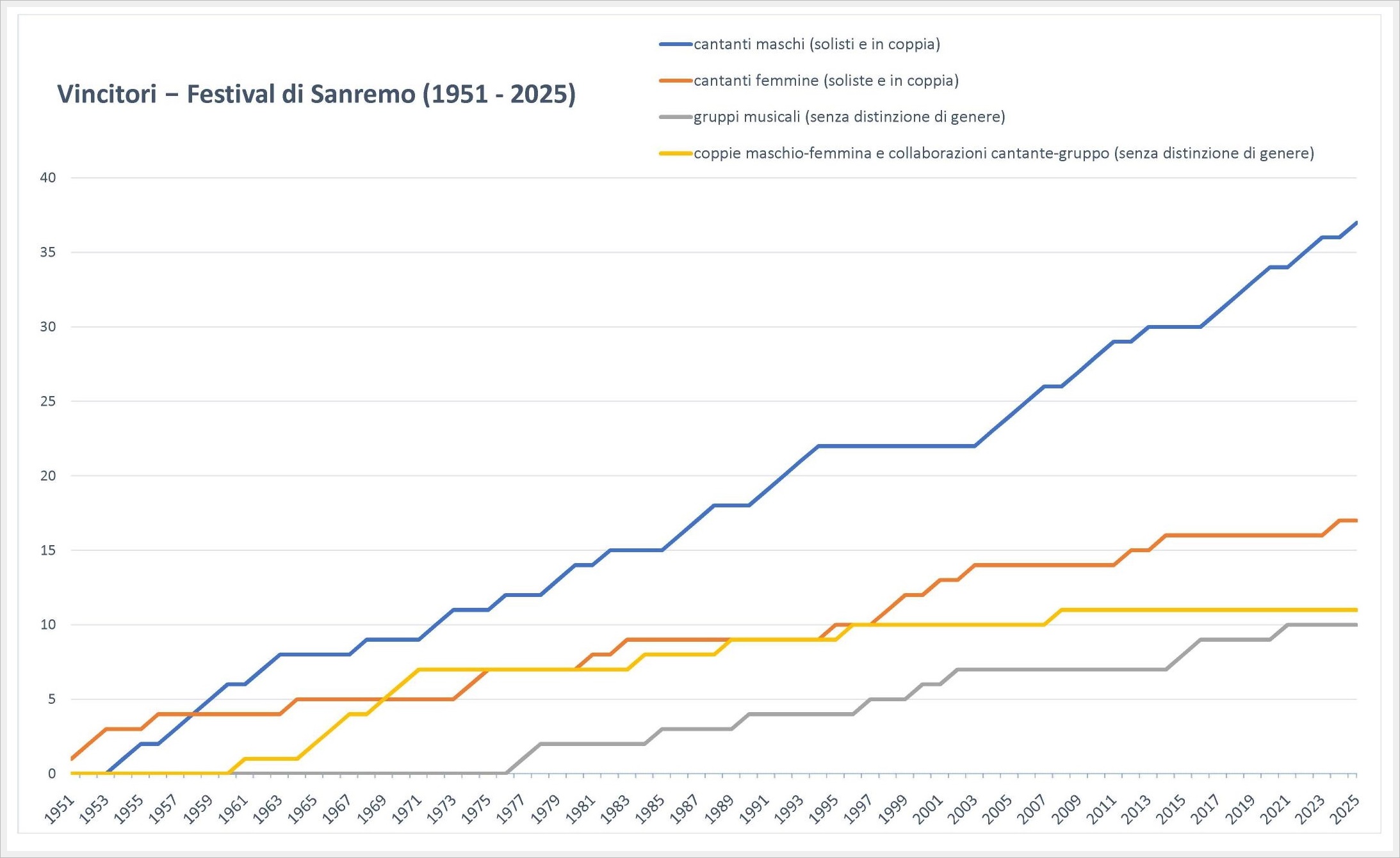 Su 75 edizioni del festival il primato a una donna solista o a una coppia femminile è stato conferito 17 volte, che equivale al 22,7% del totale vincitori. La percentuale maschile (solista, coppia o tris di uomini) è del 49,3%, i gruppi (senza distinzione di genere) rappresentano il 13,3%, i duetti uomo-donna + le collaborazioni cantante-gruppo (senza distinzione di genere) hanno raggranellato il 14,7%. Esplicito il tutto anche per chiarire i criteri di accorpamento che ho scelto per la mia analisi. Qui sotto riporto un grafico che sintetizza il progressivo dei vincitori (non dei podi, dei soli vincitori) di Sanremo dal 1951 al 2025, divisi per le categorie appena descritte. Potremmo fare diversi commenti, ciò che salta immediatamente all’occhio è l’impennata decisa della curva blu, da un certo momento in poi e soprattutto dal 2005 a oggi.