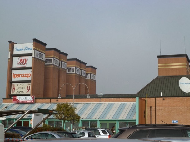 Nella seconda scena invece siamo a Parma, davanti al centro commerciale Torri, da fuori si vede l’insegna di Unieuro, Banca Monte Parma, Ipercoop, insomma le solite cose. Un centro commerciale un poco triste, a tratti quasi spelacchiato, ricorda un vecchio deposito da borsa agricola; all’interno anche una galleria con 40 negozi. Lo strillo del centro commerciale dice che da trent’anni sono il simbolo di un’architettura d’avanguardia.