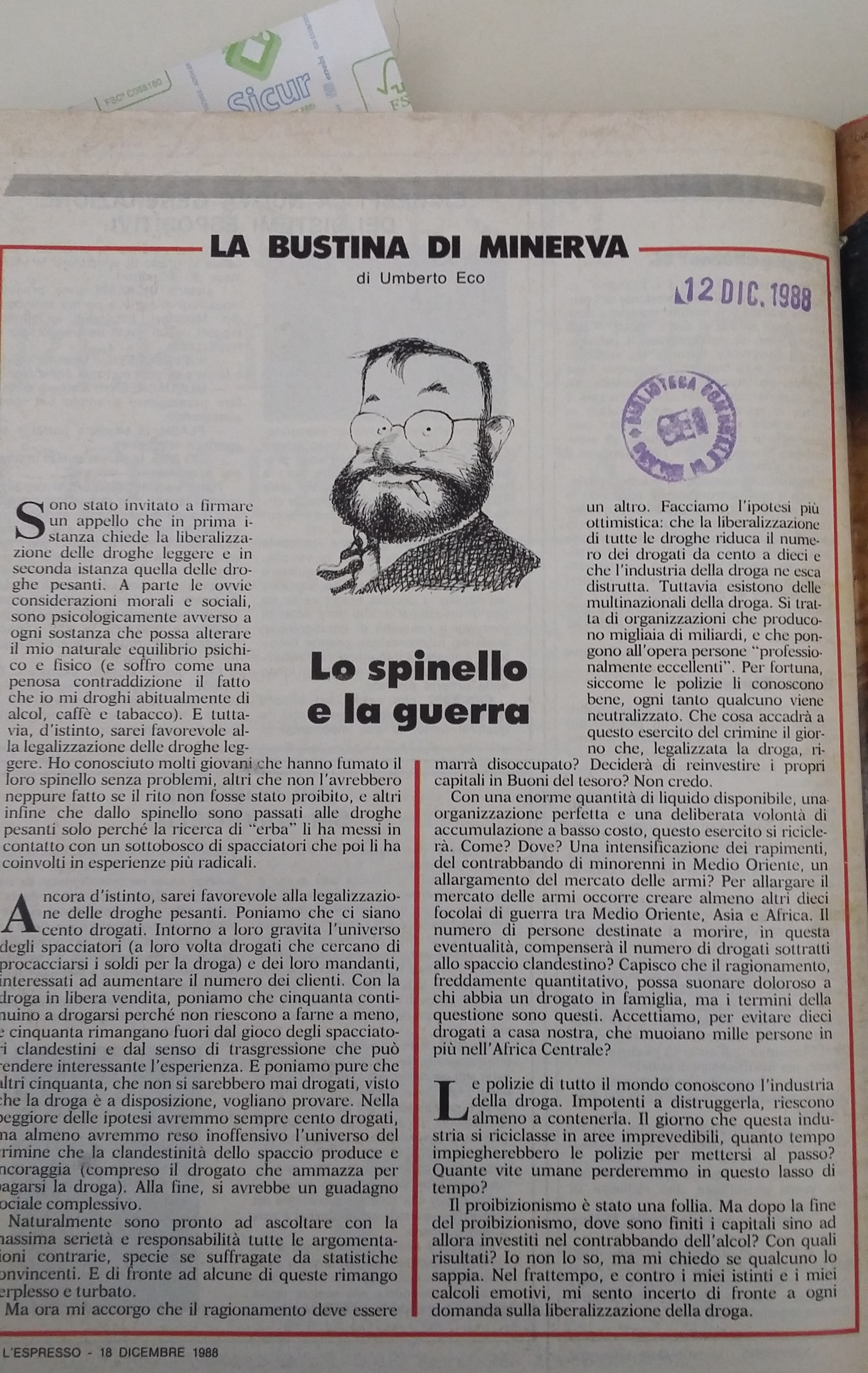 A inizio dicembre 1988, Fachinelli con altri (la legge doveva ancora passare in Senato) promuove un appello per la liberalizzazione delle droghe leggere e pesanti, lo invia anche a Umberto Eco, sodale di “Alfabeta” (anche se nella voce wikipedia, ricchissima di nomi dei contributori, non è nominato), e ne ottiene una risposta pubblica qui allegata in jpg, sotto forma di consueta “bustina di Minerva” (cliccare per ingrandirla).
