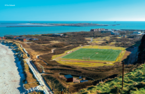 Associato alla Gran Bretagna dopo il 1807, è solo nel 1890 che l’arcipelago di Heligoland entra in area tedesca. Base navale strategica durante le due guerre mondiali, Heligoland è bombardata nel 1947 dagli Alleati per rendere l’isola militarmente inoffensiva. L’esplosione, una della più grandi non nucleari mai registrate, modificò l’aspetto generale dell’isola. Ed è sul cratere causato dalla deflagrazione che la Federazione tedesca ha in seguito finanziato la costruzione dello Sportplatz Heligoland. In seguito vi giocherà il club VfL Fosite Heligoland, creato nel 1893. Si tratta del solo terreno sul quale i giocatori del VfL possono giocare durante tutto l’anno, perché, anche se il club è associato alla Federazione tedesca, non ha mai potuto partecipare a un qualsiasi campionato. Ciò a causa della sua posizione geo- grafica – occorrono due ore di battello per raggiungere il continente – e dei costi di trasporto eccessivi per gli altri club amatoriali.