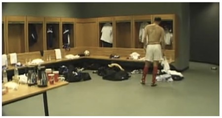 Il documentario è quello girato per il mondiale del 1998: Les yeux dans les Bleus. Sappiamo tutti come finirà: Zidane segnerà una doppietta in finale contro il Brasile di Ronaldo e Rivaldo e vincerà il Pallone d’Oro. Ma durante una delle prime partite contro l’Arabia Saudita, Zizou calpesta un avversario a terra che gli ha fatto un’entrataccia (cartellino rosso e due giornate di squalifica) e rientra tutto solo negli spogliatoi (42’15”). Si leva la maglia spalle alla camera e la getta a terra dietro di sé. Con una specie di cerotto rettangolare sulla schiena cammina verso la doccia e dà una pacca sul muro convesso, accarezza la curva del cemento. Si slaccia i pantaloncini, raccoglie una borraccia da terra e si tira l’elastico. Guarda in camera, ma di traverso, si stropiccia gli occhi e si siede sulla panca di legno. Beve un sorso dalla borraccia e mentre sta per slacciarsi lo scarpino sinistro, col piede sul ginocchio opposto, entra qualcuno a dirgli che Henry ha appena segnato: Zidane a testa bassa sospira: “Aiaiaiai”.