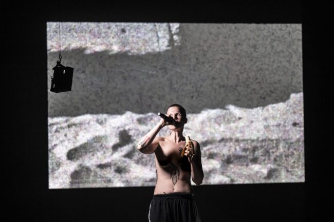 Il lungo resoconto di Carr tra paleo storia e scienza converge verso il punto chiave psicologico, messo a nudo con l’incontro con la Sciamana: “tutti i pazienti alla fine arrivano al padre” dice l’analista. L’io-ragazza-adulta, guarda il suo singolare paterno, morente. Forse desidera non condannarlo. Rosellini rende in modo anche commovente questo snodo, con una voce che è essa la “coltellata fino in fondo” di un cortocircuito di sentire ed essere. La corsa approda alla messa a nudo del corpo dipinto in scena che chiama a uno sforzo. Sulla pelle non ci sono sentenze kafkiane, ma domande di interpretazione. Che ci sia futuro o no. Questa “io” del noi, è la ragazza che sa dalla sciamana che “storicamente Il mondo appartiene a loro” (i maschi) e da Persefone che è un piacere della contraddizione la “seduzione della caverna nera” di Plutone. Sa che “era tutto prevedibile” per la specie che non lascerà traccia. Ma in questo paesaggio di “burrasca” – aggiunge e insegna la Ragazza-noi – “abbiamo il vento contro”. Però “lo abbiamo sempre avuto” dice e “questa è la cosa più confortante”. E forse è un’ultima chance.