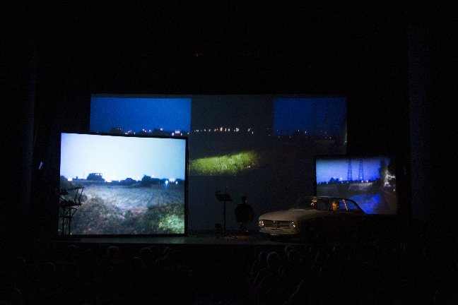 La mutazione di sesso, l’incontro in un ristorante, il rapporto sessuale consumato nei campi della brutta periferia romana. Racconta gli accadimenti la voce al tempo stesso composta e torbida, di Emanuela Villagrossi. Narratrice onnisciente, elegantissima e severa. La trama si apre nel buio sparpagliandosi in pezzi: nel rumore di pioggia incessante che copre la voce registrata di Pasolini e introduce l’azione, nei filmati proiettati sui tre pannelli video che costruiscono la scena, dentro la vecchia Alfetta parcheggiata sul palco, nel ritmo secco delle battute recitate in una postazione per il doppiaggio, nei pochi gesti solenni compiuti dagli attori, Dany Greggio e Franck Provvedi, rispettivamente a interpretare l’ingegnere e il cameriere, la borghesia e il popolo. La relazione è una relazione di potere, i ruoli si confondono solo apparentemente: ogni strattone e ogni carezza si riferiscono a una coreografia già scritta, inevitabile, a una danza a cui non ci si può sottrarre.