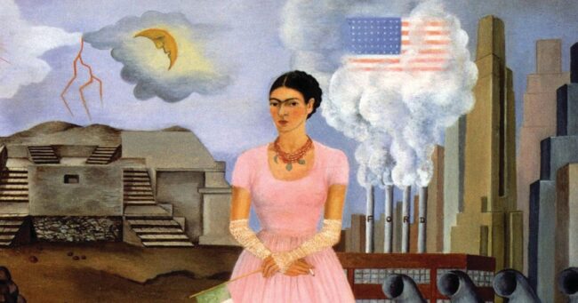 C’è un autoritratto di Frida Kahlo in cui è vestita di rosa, una bandierina messicana in mano, in piedi su una pietra che in un paesaggio immaginario segna il confine tra il Messico e gli Stati Uniti. Il dipinto si chiama Self-Portrait on the Borderline Between Mexico and the United States, è del 1932, ed è stato realizzato a Detroit. Dei suoi anni americani, necessari nel definire l’artista che sarebbe diventata, racconta oggi un impeccabile volume pubblicato di recente negli States. Il libro si chiama Frida in America. The Creative Awakening of a Great Artist (St. Martin’s Press, pp. 383, 29.99 $), Celia Stahr è l’autrice.